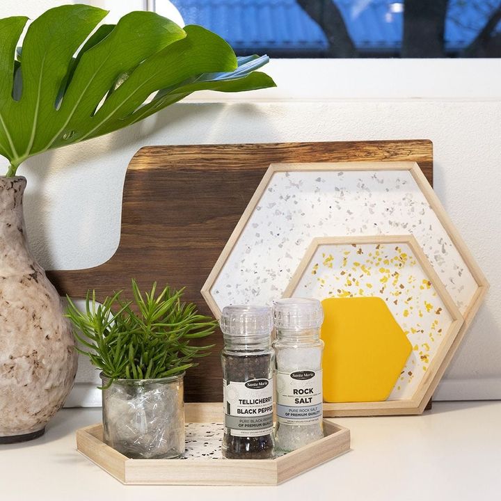 Создадете најстилски послужавници дома за кои секој ќе ви завидува. Сетот содржи три шестоаголни послужавници изработени од светло дрво со различна големина. Најголемиот послужавник има дијаметар од 31 см, средниот 26 см и најмалиот 21 см. Насликајте уникатни модели на нив во комбинација со декупаж. Можете исто така да ги преплавите со смола или да создадете шармантен мозаик.